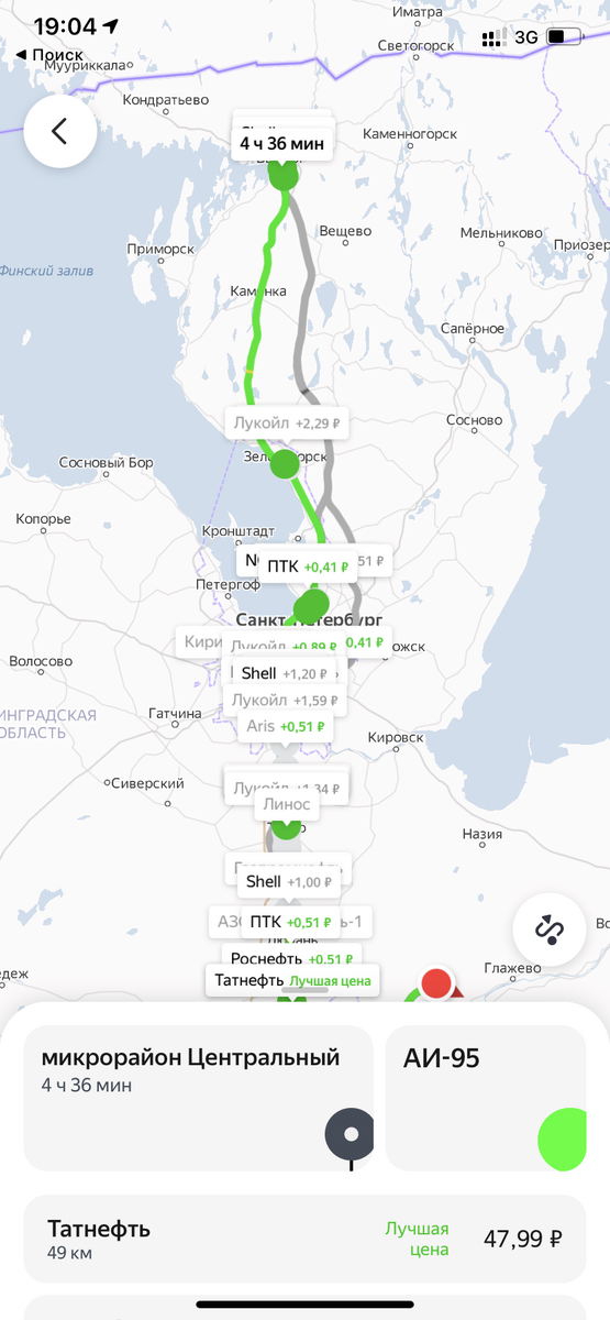 Случайно узнал как перед поездкой просто узнать цену топлива на АЗС, которые будут по дороге. Запускаешь приложение Яндекс.Заправки, выбираешь точку финиша, свое топливо и сразу видишь самую низкую цену и все остальные. Удобно. От Московского шоссе до Выборга 95 бензин на Татнефть дешевле всех! А у них ведь еще и какая то дисконтная система есть! Приложение изначально я поставил для другого. Для того, чтоб через него оплачивать бензин не выходя из машины. Ну, об этом вы наверняка слышали. Приезжаешь на АЗС, запускаешь приложение, выбираешь топливо, колонку и количество литров. Хочешь полный бак - выбирай максимальное количество литров, обычно хватает. Оплачиваешь привязанной картой или картой через ApplePay. Сколько топлива не влезет вернут обратно на карту. Так как сейчас на всех АЗС заправщики, то реально можно не выходить из машины. Они и заправят. Дисконтные карты разных АЗС тоже привязываются в приложении. Также есть дополнительные скидки от банков. Ну, и скидка 2₽ на ли