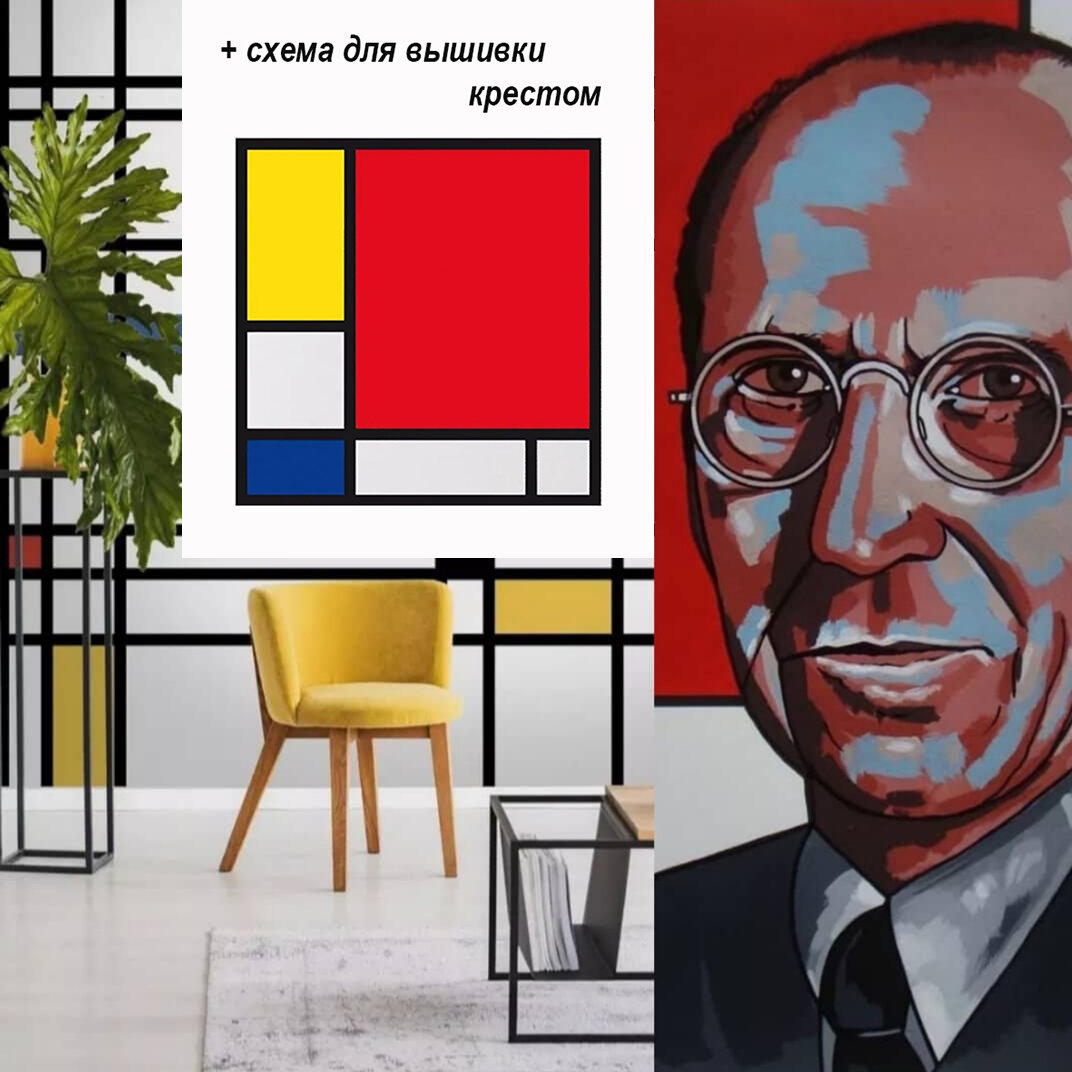 Питер Карнелис Мондриан, он же Пит Мондриан жил и работал в начале прошлого века в Нидерландах. Он одновременно с Малевичем и Кандинским положил начало абстрактной живописи. Мне он откликается больше других своей четкостью линий и чистотой красок. Моё знакомство и его творчеством было постыдным для меня. Я работала в крупной мебельной компании и наша дизайнер Ирина решила оформить салон в стиле его работ. Обсуждая эти изделия с цехом и монтажниками она, правда, почему-то называла их "Тетрис". Вот что получилось: А потом ко мне пришёл заказчик и попросил сделать что-то в стиле Мондриана... А у меня техническое, не художественное образование и я вообще не поняла, чего он от меня ждёт. Хотя за спиной эти двери. Как же мне было стыдно, когда я поняла о чем речь!!! Ну и зла на дизайнера. С тех пор и началась моя любовь к его работам. Эта, пожалуй, самая известная из них: Я решила сделать такую брошь и думаю: получилось удачно! Сзади я п леской для бисера пришила специальную булавку и закр