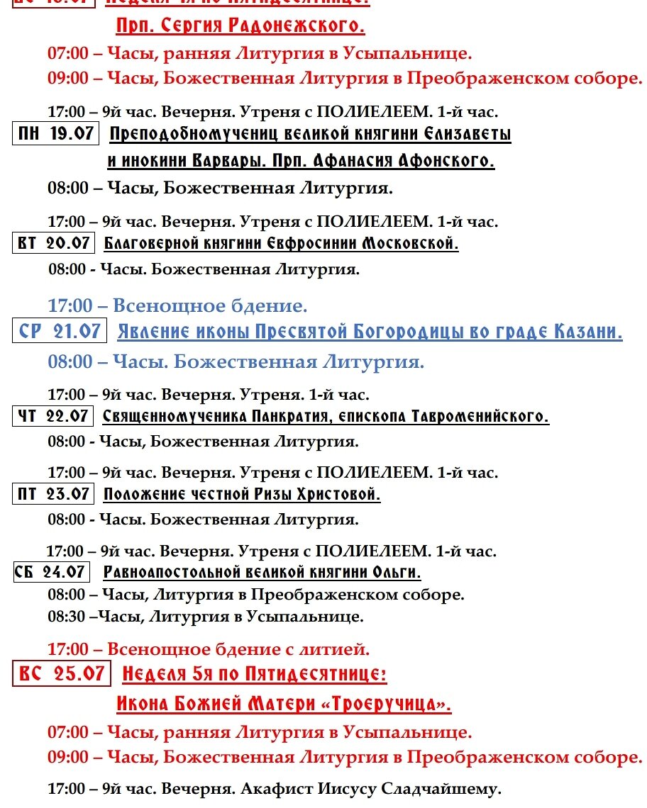 🗓 Расписание богослужений в Новоспасском обители на текущую неделю.