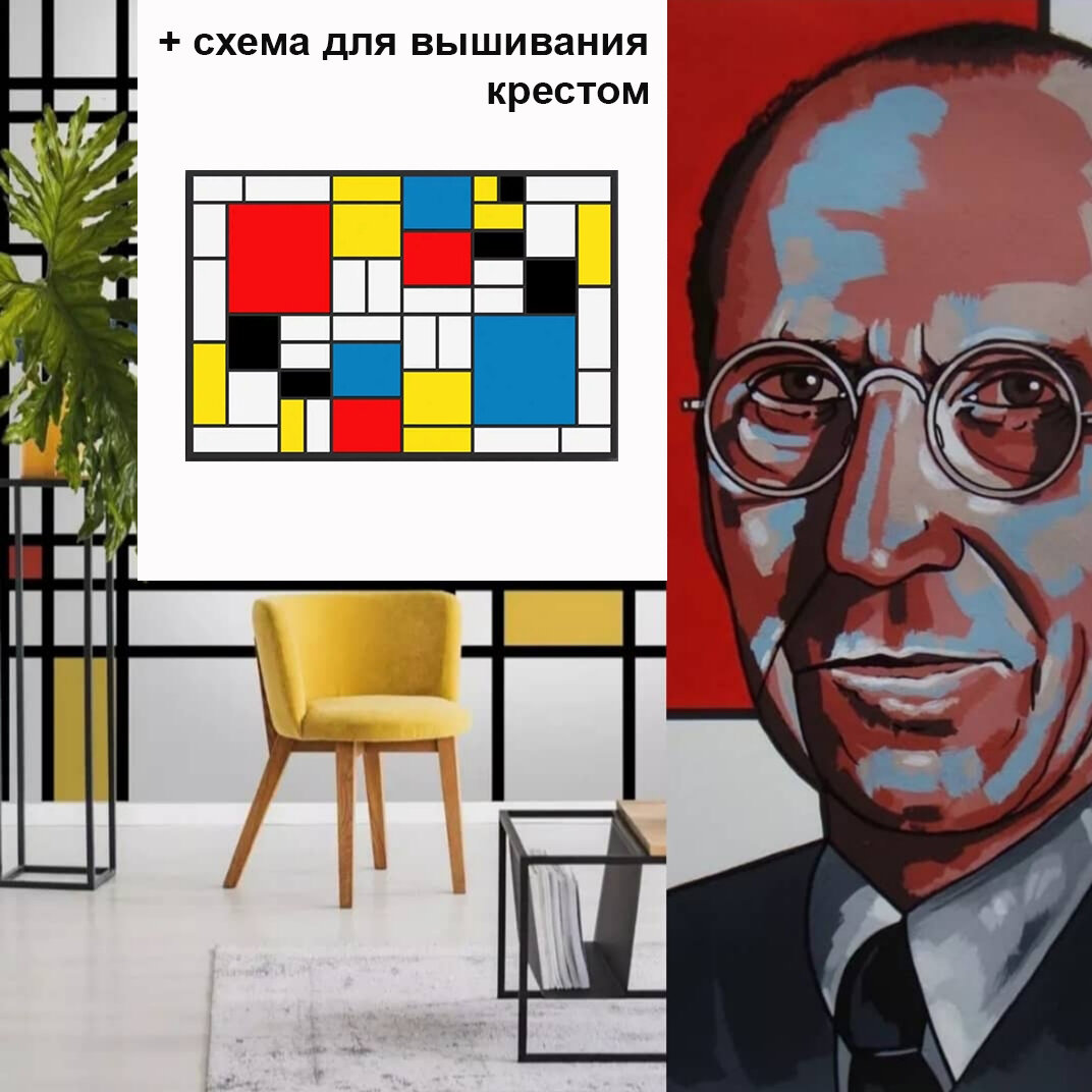 Пит Мондриан жил в Нидерландах с 1872 по 1944 годы и одновременно с Малевичем и Кандинским положил начало абстракционизму. Еще при его жизни в 1930-ых годах французский модельер Лола Прусак создала линейку чемоданов и сумок, вдохновленная поздними работами Мондриана. Позже в 1965-1966 Ив Сен Лоран представил коллекцию трикотажных платьев "Мондриан": А у меня ежедневник в его стиле! Рядом сделанная мной брошь. Схему для вышивания этой броши можно найти в предыдущей статье: https://zen.yandex.ru/media/id/5fb14c7c19143619277e5573/strasti-po-mondrianu-chast-1-shema-ego-kartiny-besplatno--60f45f51b499d11ca9b972c2 Схемы на эти мои работы ниже: https://zen.yandex.ru/media/id/5fb14c7c19143619277e5573/strasti-po-mondrianu-chast-2-shema-ego-kartiny-besplatno-60f47d06b499d11ca9fcf6b4 А ниже схема на эту работу Пита Мондриана: Работа небольшая и можно использовать остатки ниток / бисера, не подбирая артикулы. Я бы взяла чистые цвета. Не тёмные и не светлые. А просто черный, белый, жёлтый, красный