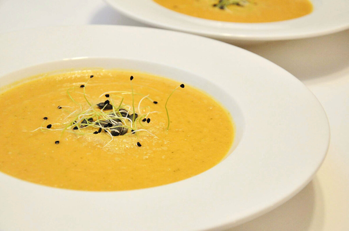 Тыквенный суп можно приготовить множеством разных способов, но, несомненно, это один из самых сытных и сливочных рецептов! Ингредиенты: 500 г посыпанной мукой тыквы 1 сладкий картофель 1 большая морковь 2 большие луковицы 1 банка (400 г) белой фасоли 1,5 стакана дрожжевых хлопьев соль, перец по вкусу 2 чайные ложки смеси трав «Острый» или чесночного порошка. масло для жарки Способ приготовления: Очистите морковь и сладкий картофель. Морковь натереть на терке, картофель нарезать кружочками. Очистите тыкву, натрите на терке и нарежьте небольшими кусочками. Лук очистить и нарезать. Разогрейте масло в глубокой кастрюле и обжарьте лук и морковь. Когда лук станет прозрачным, добавьте тыкву и картофель. Налейте достаточно воды, чтобы покрыть овощи, а затем варите до мягкости (около 15 минут). Когда суп немного потускнеет, добавьте фасоль, соль, перец и дрожжевые хлопья. Приготовьте крем-суп с помощью ручного блендера.