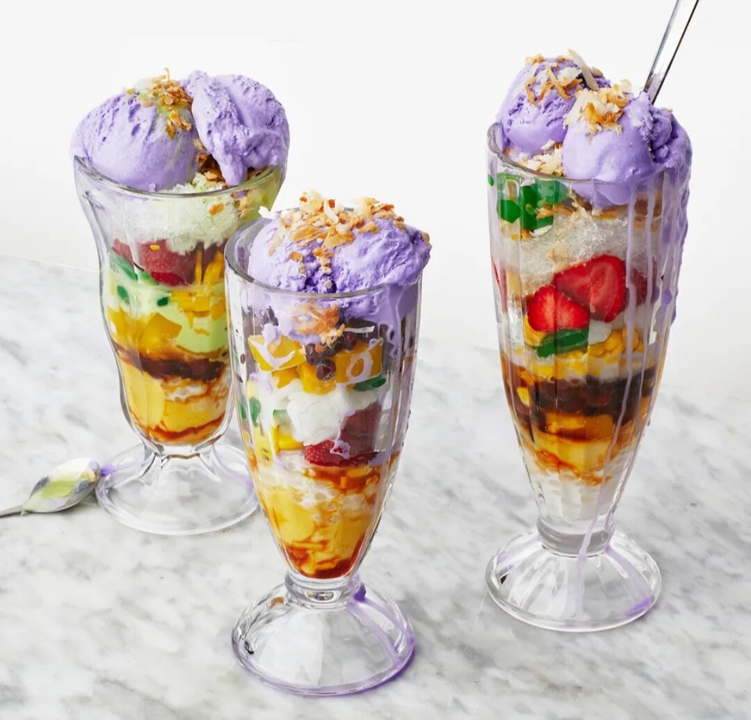 Гало-гало-один из моих любимых летних десертов. С Филиппин—название на тагальском означает “микс-микс"—освежающее блюдо наносит слой льда и сгущенного молока поверх всевозможных ингредиентов для получения конечного результата, который имеет множество контрастных текстур, от жевательной до хрустящей, от сливочной до липкой. Хотя компоненты различаются, вы найдете некоторые общие дополнения в большинстве тележек и баров halo-halo: желе, флан, макапуно, семена пальм, подслащенные красные бобы, бритый лед, мороженое ube, свежие фрукты, поджаренные кокосовые хлопья, пинипиг. В моей версии используется желе из манго со свежими фруктами, а также подслащенное сгущенное молоко, настоянное на пандане.