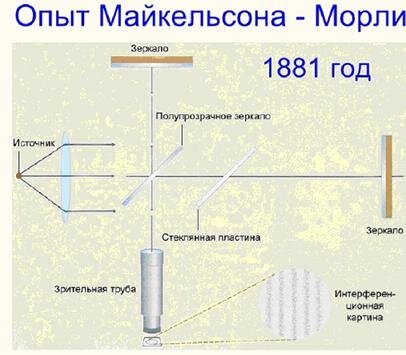 Опыт Майкельсона—Морли был принципиально направлен на то, чтобы подтвердить (или опровергнуть) существование мирового эфира посредством выявления «эфирного ветра» (или факта его отсутствия). Действительно, двигаясь по орбите вокруг Солнца, Земля совершает движение относительно гипотетического эфира полгода в одном направлении, а следующие полгода в другом. Следовательно, полгода «эфирный ветер» должен обдувать Землю и, как следствие, смещать показания интерферометра в одну сторону, полгода — в другую. Итак, наблюдая в течение года за своей установкой, Майкельсон и Морли не обнаружили никаких смещений в интерференционной картине: полный эфирный штиль! (Современные эксперименты подобного рода, проведенные с максимально возможной точностью, включая эксперименты с лазерными интерферометрами, дали аналогичные результаты.) Итак: эфирного ветра, а, стало быть, и эфира не существует.