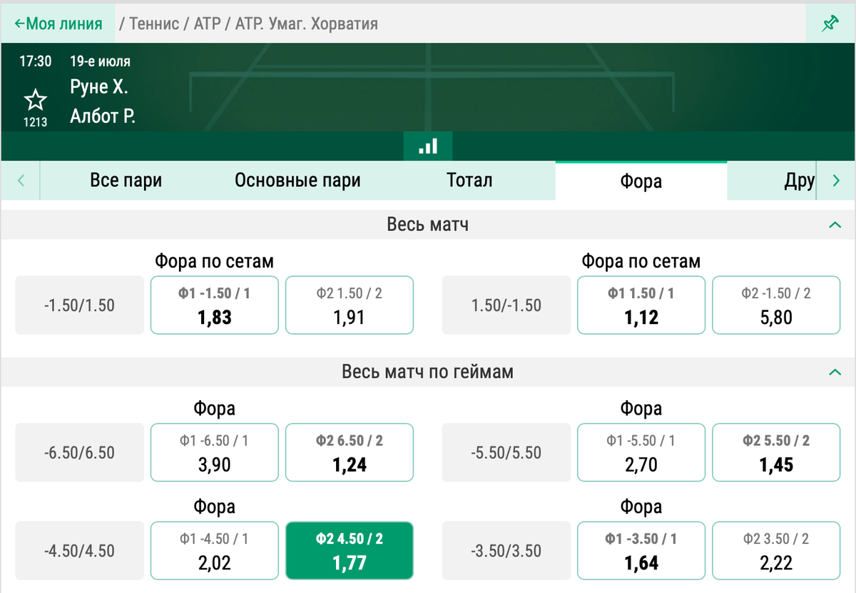 Заходим по линии на теннис. Описание к ставке: Юный 18-летний датчанин Хольгер Руне, который через пару лет, будет в рейтинге ТОП 50 теннисистов, сыграет в сегодняшнем матче против возрастного опытного соперника Раду Албота. Что же одержит ввверх в сегодняшнем противостоянии? Скорость и энергия либо опыт с практичностью? Албот расположился в данный момент на 92 строчке рейтинга и сыграл уже в недавнем матче против Руне, потерпев поражение, крайние матчи вышли неудачными для молдованина. Теперь же, разведав игру молодого соперника, уверен, Раду сыграет более осторожно и прагматично. Потому беру Фору (5) на молдованина. Ставлю в этом матче на опыт Албота, пришло время выигрывать )) Удачи нам, братцы! ✅ Для того, чтобы поставить ставку нужно зарегистрироваться