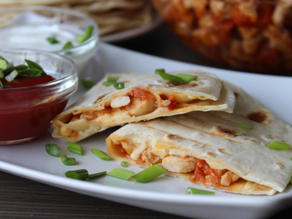 Очень часто можно встретить название "кесадилья" - блюдо мексиканской кухни, представляющее собой две лепёшки (тортильи) с начинкой. Предлагаю Вашему вниманию кесадию с куриной начинкой. Попробуйте приготовить один раз, и это блюдо станет одним из ваших любимых! Ккал: 206.79, время приготовления: 40-60 мин., порций: 15 #Салаты и закуски #Скалка #Сковорода для гриля #Мексиканская #Блюдо из курицы Тесто для лепешек (тортилий) Начинка Приготовление: 1. Для начала замесим тесто. В 4 ст. муки вливаем 1 стакан тёплой воды, добавляем 1 ч.л. соли и 3 ст.л. растительного масла (можно оливкового). Тщательно перемешиваем и замешиваем тесто. Оно должно получится однородным и достаточно эластичным. Накрываем миской и оставляем отдохнуть., приступим к приготовлению начинки. 2. Около 600 гр. куриного филе (я использую грудку) режем на мелкие кусочки и выкладываем в сковороду с раскалённым растительным маслом. Солим и перчим по вкусу и тушим до тех пор пока не выкипит вся жидкость, а курица не ста