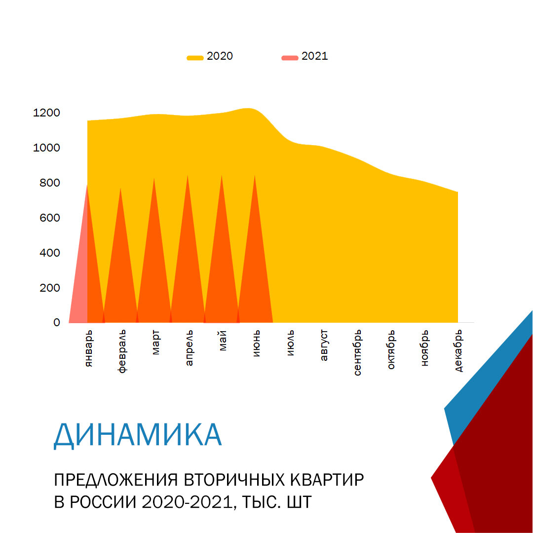 Таким образом, в первой половине 2021, заметно увеличение спроса на вторичное жильё, что выражено в росте цен и сокращении