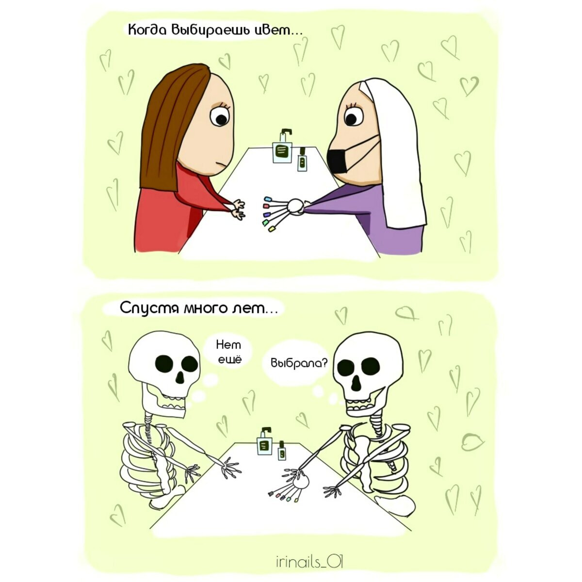 Маникюр и педикюр уже настолько прочно вошли в нашу жизнь, что стали неотъемлемой ее частью. Мы привыкли быть в постоянном поиске идеального мастера, подходящего гель-лака и своего любимого дизайна. Все это породило множество забавных ситуаций, курьезных случаев и мемов. Мы собрали для вас самые веселые комиксы, объединив их в один обзор, способный поднять любое настроение! Выбрать цвет для покрытия бывает нереально сложно, особенно, если у мастера богатая цветовая палитра. Готовьтесь к посещению заранее, просматривайте Instagram и Pinterest, сохраняйте понравившиеся картинки. Так вам будет проще сделать свой выбор, сидя в кресле у мастера. Но и перекидывать все на плечи мастера тоже не стоит. Это очень раздражает и никак не поможет ускорить процесс. Помните мастер-ваш друг и тоже человек. Не выводите его из себя! У каждого мастера есть топ-вопросов, которые выбивают из его из колеи. Цените своего мастер. Спрашивайте только то, что действительно важно в данный момент! Фотографии ма