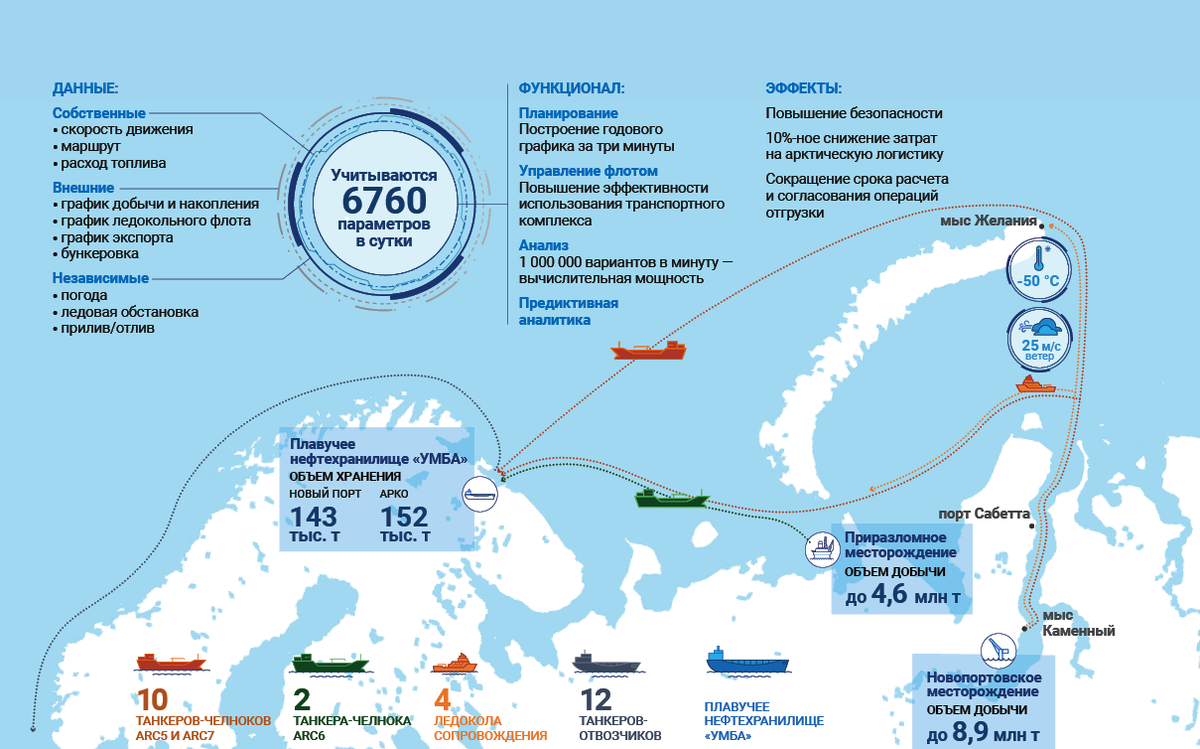 Разработка арктического шельфа – перспективное для России направление нефтяной отрасли. Около 100 млрд барр нефти скрыто в глубинах северного побережья и ледяных морях Арктики. Но добывать нефть за Полярным кругом тяжело и дорого, ведь, кроме низких температур, ледников и постоянных штормов в северном регионе плохо развита транспортная инфраструктура. Справиться со сложностями нефтяникам помогают современные цифровые технологии, одна из которых называется «Капитан». «Капитан» – это искусственный интеллект, который управляет логистической цепочкой перевозки арктической нефти. Расчет ведется на основе сложных математических алгоритмов, которые позволяют системе выбрать наиболее оптимальный график движения судов. Учитывается сила и скорость ветра, температура окружающей среды и ледовая обстановка в регионе. «Капитан» позволяет нефтяникам вести круглогодичный вывоз сырья с арктических месторождений. В среднем программа анализирует более 15 тыс. вводных данных, чтобы из более чем 60 млн воз