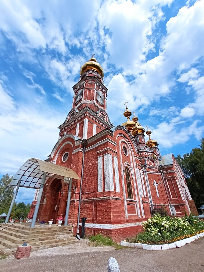 Красивый храм в честь Казанской иконы Божией Матери в Осе был освящен в 1882 году. Его построили вместо ветхой деревянной церкви на средства местного купца Алексея Осипова и на пожертвования других благотворителей В 1939-1944 гг. храм был закрыт, сейчас действует. С 1944 по 2004 годы Богородице-Казанская кладбищенская церковь была единственной действующей церковью в районе. Идет постепенная реставрация. Необычный поклонный крест у кладбища резной храм на кресте Фото подруги: храм со стороны кладбища