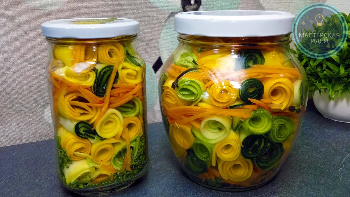 Сегодня я заготавливаю кабачки на зиму. Эта вкусная, яркая заготовка, непременно, придется по вкусу всем любителям необычной консервации. Кабачки получаются хрустящими и ароматными, открыв такую баночку зимой, можно насладиться вкусом настоящего лета! Если вы еще не заготавливали так кабачки на зиму, рекомендую! Получается красиво и вкусно, как не крути, попробуйте! Необходимые ингредиенты и видеорецепт вы можете увидеть в конце статьи ⤵️⤵️⤵️ Приготовление: хорошо промываю кабачки и нарезаю их овощечисткой тонкими полосками. На тёрке для корейской морковки натираю морковь. Очищаю несколько зубчиков чеснока и промываю зонтики укропа. В чистую банку отправляю чеснок, зонтик укропа, душистый, черный перец горошком и немного натертой моркови. Кабачки сворачиваю в рулетики И укладываю их в банку, чередуя с натертой морковью. Когда банки наполнены, делаю маринад: в сотейник с водой добавляю соль с сахаром, перемешиваю и довожу до кипения. Затем снимаю его с огня и добавляю уксус. Банки с