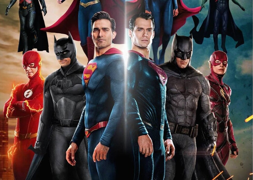 Лига справедливости Конфликт на двух Землях, арт изображает столкновение героев Arrowverse и DCEU