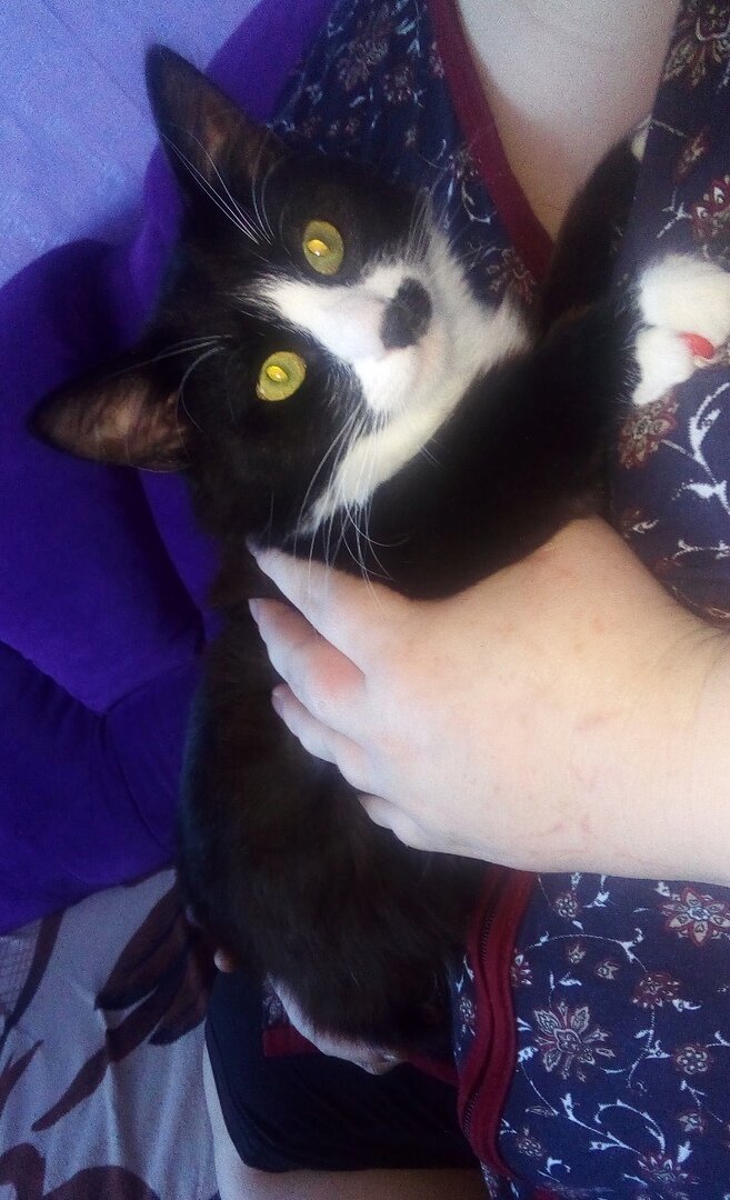 Черно-белый котенок с маленьким пятнышком около носа прожил у сестры неделю, потом другую, и все так к нему привыкли и полюбили, что перестали искать новых хозяев – решили оставить себе.