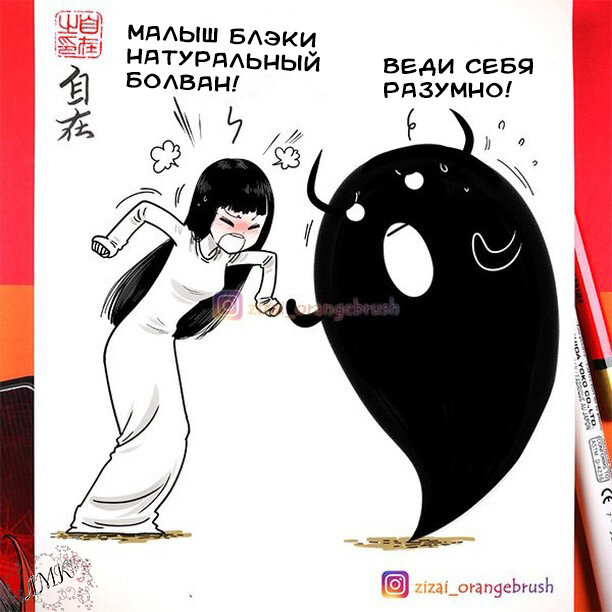 Пока Цзы Цзай еще не выложил продолжение комиксов о Полудемоне и Ведьме, которые являются родителями Демоненка, я перевела несколько историй об отношениях Садако и малыша Блэки. Чувствую, что и под этой статьей соберется несколько очень добрых человек, которые не поймут поведение девушки и начнут говорить про нее всякие гадости. Очень надеюсь, что я ошибаюсь, но предупреждаю сразу - заблочу! Почему сразу появилось такое предупреждение? Все просто, Садако и Блэки в новом комиксе поругались. Да, девушка у черного демона довольно эмоциональная, а Блэки довольно мягкий и наивный парень. Так что, если уж они ругаются, то отхватывает он! В общем, неизвестно из-за чего, но и в этот раз все вышло именно так: Однако, помимо своего взрывного характера, Садако имеет очень романтичные черты. Она всегда защищает Блэки от Даосского священника, заботится о его здоровье, готовит ему покушать, если тот задержался на работе. Мало того, она и готовить учится только ради того, чтобы Блэки смог есть вкусну