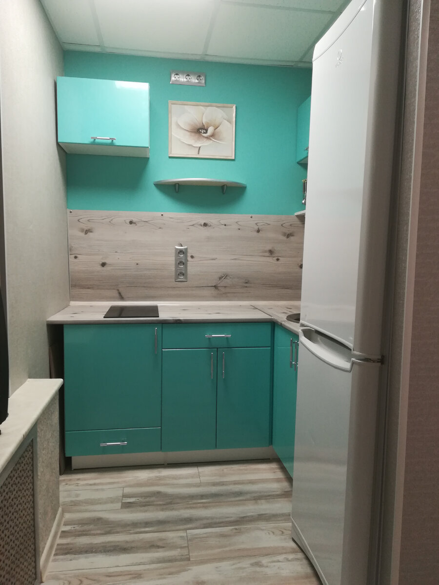 И другими яркими акцентами… Мы уже писали об оригинальной студии, оформленной теми же хозяевами. И то, и другое жилое пространство появились в результате переделки помещения площадью 106 квадратных метров, ранее служившего магазином. Теперь же ему вернули статус жилого и сделали в нем несколько студий под сдачу. В этой квартире за основу взят теплый серый цвет, который оттеняют более светлые двери и полы. При соблюдении общей цветовой гаммы, каждая функциональная зона оформлена по-своему. К тому же здесь площадь позволила не только визуально, но и перегородкой отделить кухню. Сама кухня выполнена в ярком бирюзовом цвете. У электроплиты всего две конфорки, что позволило расширить поверхность для готовки. Кроме того, ее дополняет микроволновка. В небольшом закутке свободно развернется только один человек, но студия и не рассчитана на большую семью, не так ли? Прихожая лаконичная, с металлической вешалкой и подставкой под обувь. А вот в жилой части появляются яркие акценты – покрывала, д