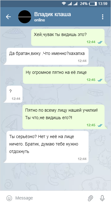 Впервые это произошло в школе: на уроке истории, который в тот день был уже пятым уроком. Наша учительница Наталья Владимировна (имена изменены) немного опоздав, как обычно, вошла в класс, положила все свои вещи на стол, медленно села на стул и повернулась к нам. В этот момент я чуть было не упал со стула увидев её лицо: по всей голове Натальи В. растекалось странное, огромное пятно: темно-коричневое... нет, даже скорее цвета чуть сгнившего апельсина. Это пятно уже вот-вот подсыхало у нее на голове и шее. Наталья В. принялась вынимать из сумки учебные материалы, как будто у неё на лице нет никакого пятна странного цвета! Мое удивление, перераставшее в истерический смех уже угасло и начинало переходить в беспокойство, и я кинул взгляд на класс – чтобы увидеть, как они реагируют на это пятно. Я сидел один на задней парте,а мой друг Владик сидел прямо перед ней. Я написал ему: Тут я ушёл в себя до конца урока, сидел в раздумии : может это просто иллюзия, игра света, может друзья надо
