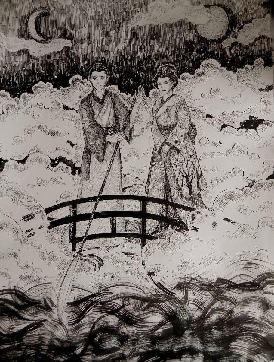 Идзанами и Идзанаги – это боги творения и смерти, прародители, брат и сестра, которым старшие божества поручили превратить «носящуюся по морским волнам землю» – будущую Японию – в пригодный для жизни край. Для этого они подарили Идзанами и Идзанаги драгоценное копьё. Им два бога замесили морскую пучину и спустились на остров, который образовался из капель воды, упавших с копья. Там они воздвигли небесный столб и возвели просторные покои. Изучив тела друг друга, Идзанами и Идзанаги поняли, что могут родить страну. Но чтобы это сделать, было необходимо пожениться. Для этого боги должны были обойти небесный столб с разных сторон навстречу друг к другу и сказать заветные слова: «Поистине, прекрасный юноша!», «Поистине, прекрасная девушка!». Первой заветные слова произнесла Идзанами, чем взволновала своего мужа-старшего брата: «Нехорошо женщине говорить первой». И действительно всё у них стало получаться не так: первое дитя было пиявкой. Вторым родился Пенный остров. Обоих не сочли всерьёз