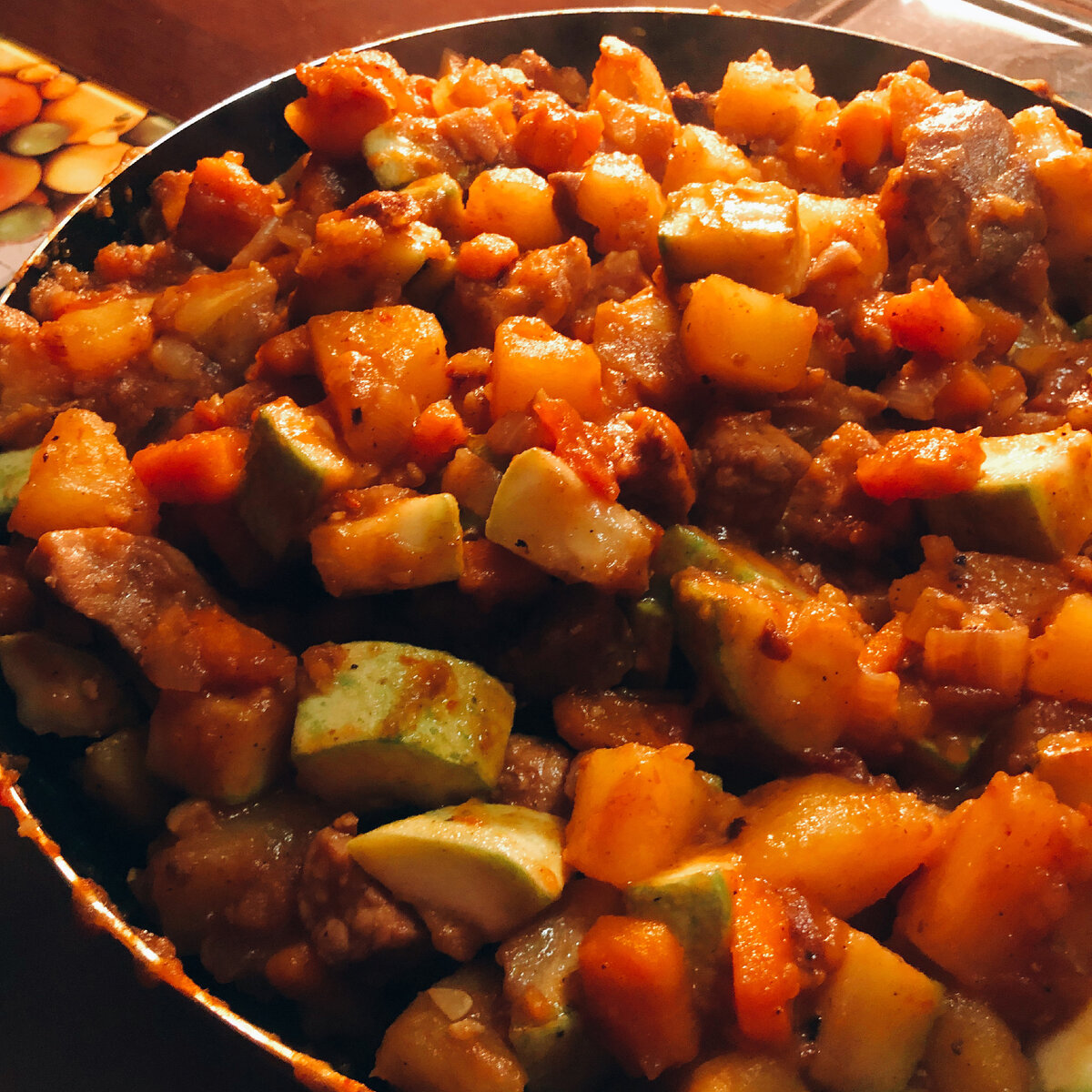 Привет, читатель! Сейчас лето - сезон кабачков, предлагаю приготовить сегодня рагу с кабачками! Я буду готовить с мясом, но это не обязательно, можно и без него. Нам понадобится: Мы сегодня будем готовить в такой последовательности, что овощи будут хорошо протушены, а кабачок останется хрустящим. Получается очень вкусно! Сначала займемся кабачками - их следует нарезать крупными кубиками и обжарить на большом огне до золотистой корочки. Самое главное не передержать кабачки, иначе они станут мягкие и превратятся в кашу. Когда кабачки поджарились, перекладываем их в другую посуду и займемся мясом. Его нарезаем небольшими кусочками и так же поджариваем до золотистой корочки, немного посолив. Когда мясо будет готово, его так же перекладываем в отдельную посуду. Морковь и лук нарезаем полукольцами и отправляем в сковороду. Когда овощи немного поджарятся - добавляем нарезанный крупными кубиками картофель, жарим его с овощами так же до корочки, в конце овощи немного солим. К овощам добавляем м