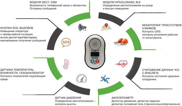 - персональные трекеры Goodwin – беспроводные переговорно-поисковые устройства (БППУ) (их функциональные возможности показаны на рис. 1). Устройство производится в двух вариантах – общепромышленном и взрывозащищенном, имеет степень пылевлагозащиты IP65 и работает в сетях LoRaWAN и DECT, получая информацию через сети маяков BLE или через спутниковую систему навигации GNSS. Предусмотрены также модификации для работы трекера с использованием Глобального стандарта мобильной сотовой связи GSM, стандарта сотовой связи для устройств телеметрии с низкими объемами обмена данными NB-IoT и стандарта беспроводной высокоскоростной передачи данных LTE;