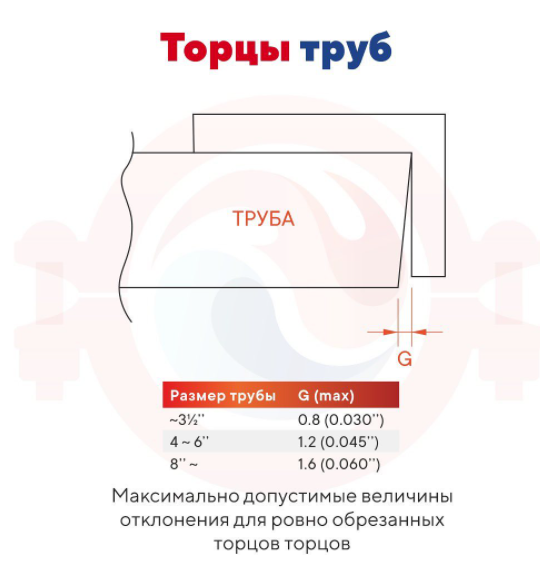 ❗Рекомендуется использовать трубы с ровным концом, но допускается и применение труб со скошенным концом с толщиной стенок не более 0,375’’/9,5 мм и размерами скоса 37-1/2 ± 2-1/2° или 30°.