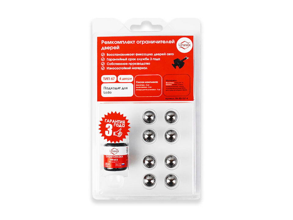 инструкция по установке — 1 шт. 1. Снимите внутреннюю обшивку двери. Выкрутите болт и две гайки крепления ограничителя двери и извлеките его из двери. 2. Вынимаем опорные скобы. 3. Извлеките фиксатор и пружину. Повторите операцию для второй стороны. Вы увидите стальные фиксаторы. 4. Очистите шток, корпус и пружины от грязи, насухо протрите их. Аппликатором нанесите со всех сторон сухую смазку на шток. Дайте смазке высохнуть несколько минут. Сухая смазка сделает ход ограничителя мягче на этапе притирки. 5. Замените стальные фиксаторы новыми шариками, вставьте их в пружины и установите в корпус. 6. Прижимая пружину заглушкой, вставте опорную скобу в прорезь, затем задвиньте ее до упора. Повторите операцию для другой стороны ограничителя. 7