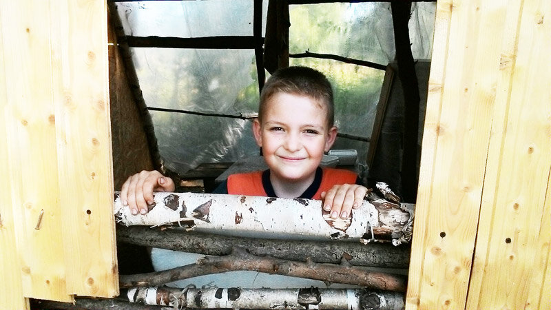 — А еще я очень быстро бегаю, у меня пять по физкультуре, — сообщает Тимоха, ведя к «шалашу», сооруженному фроловской детворой собственными руками. Кто в детстве не строил дома, тот не знает, что такое настоящая гордость.