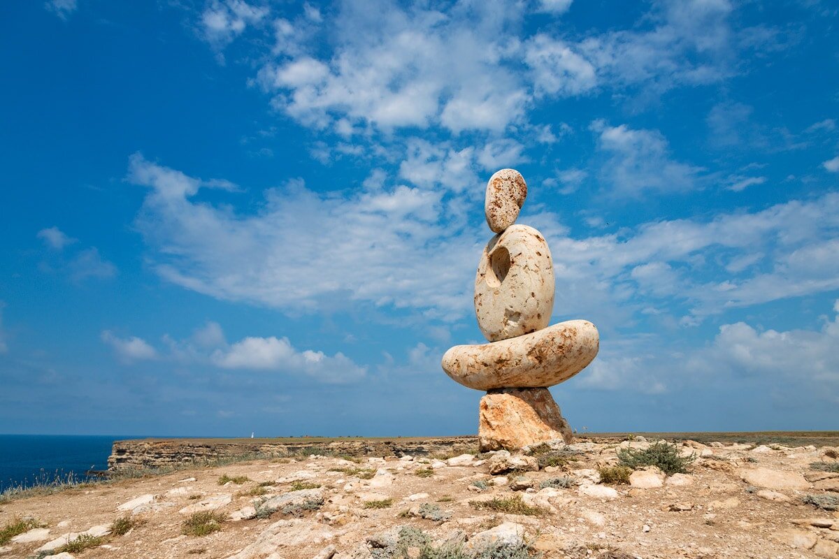 Она представляет собой композицию из трех водруженных друг на друга камней, и напоминает человека, сидящего в позе лотоса. Скульптура символизирует единство природы и человека. Любопытно, что в одном из камней прорезано отверстие, и это неспроста. По замыслу архитектора, именно в это отверстие попадают лучи солнца на закате и образуют тем самым "Сердце Тарханкута". И сама скульптура, и открывающиеся отсюда виды на побережье - создают чувство спокойствия и умиротворения.