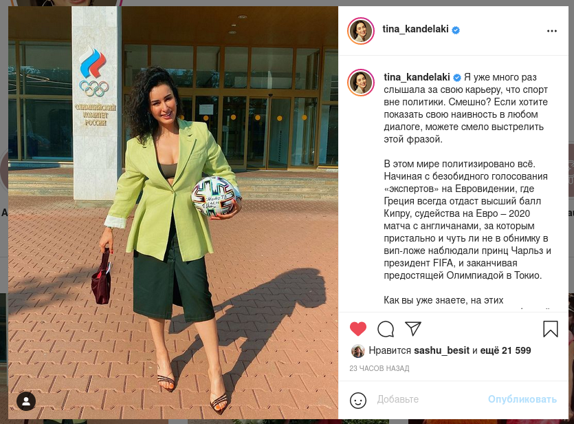 Генеральный продюсер телеканала «Матч ТВ» Тина Канделаки решила запустить флешмоб, который будет направлен на поддержку российских спортсменов, которые на Олимпийских играх в Токио будут выступать под нейтральным флагом. «Я запускаю не флешмоб и не акцию, а целое движение, о котором должен узнать весь мир. Мы зажжем на этой Олимпиаде! И наставим рога всем, кто в нас не верит. We will ROC you, Tokyo🤘», — заявила она. На Олимпиаде отечественные спортсмены будут выступать под сокращенным названием ROC (Russian Olympic Committee). К флешмобу уже проявил интерес рэпер Тимати, который попросил своих поклонников последовать его примеру. Давайте поддержим сборную!!! И не забывайте про хештег #wewillROCyou — пусть он разлетится по всей Сети!