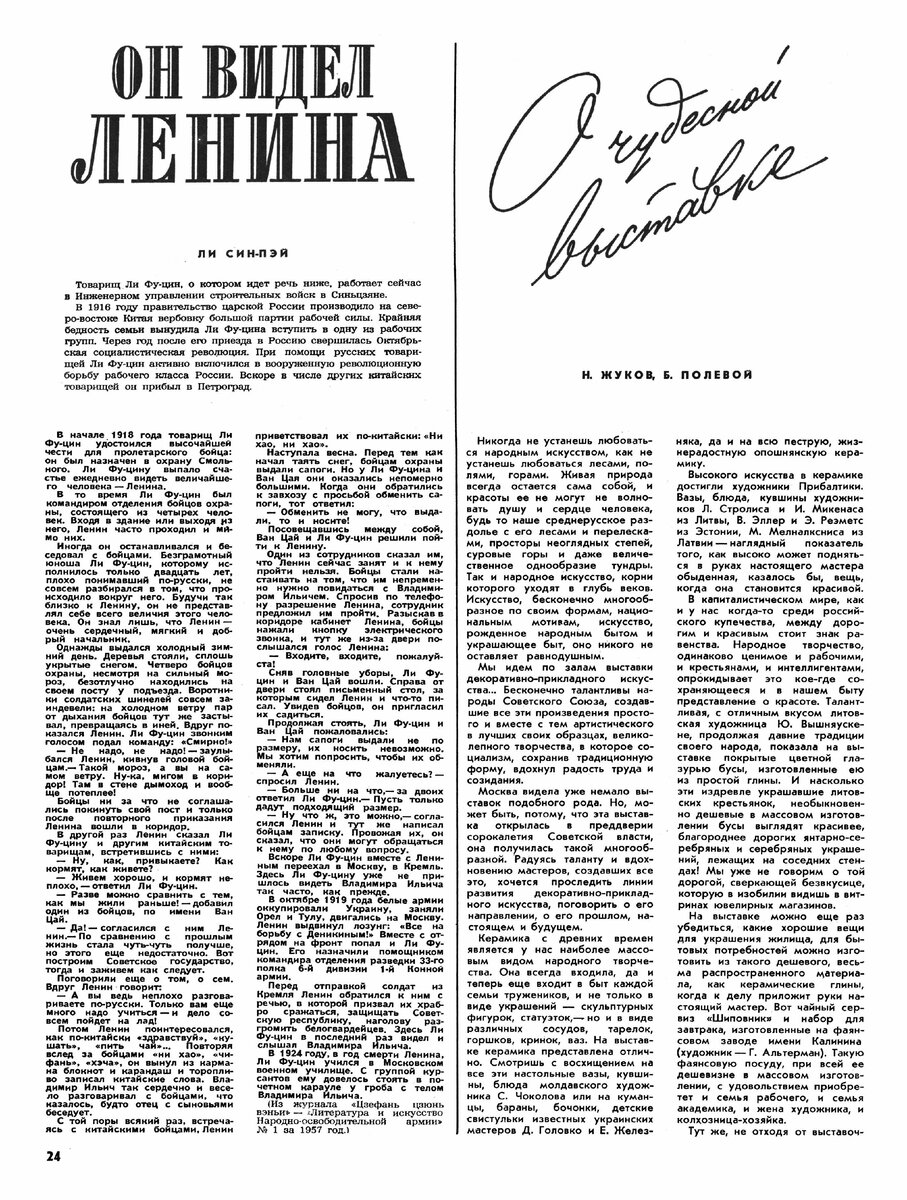 Жуков Н., Полевой Б. О чудесной выставке // Огонёк, 1957. – № 17 (1558), 21 апреля. – С. 24–25 (доп. 2 цв. вклейки).