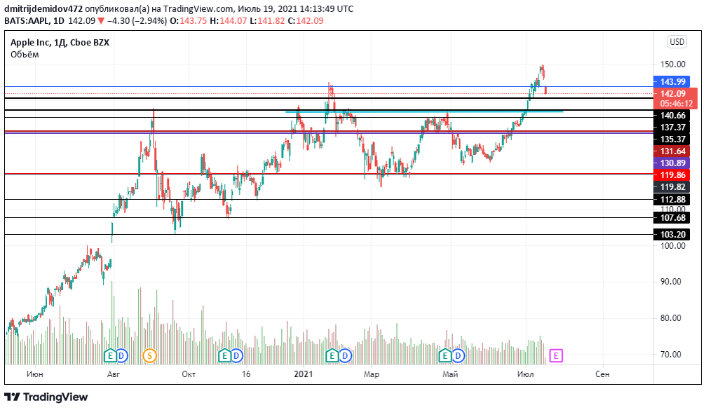 Итак, надеюсь, что вы читали нашу аналитику с утра и заранее смогли принять необходимые меры. Индекс S&P 500, как было сказано с самого утра открылся естественным образом в минус и падение составляет -1.72% за 40 минут после открытия. Падают и технологические компании и многое другое. Единственное в чем ошиблись, так это в Virgin Galactic. На чем растет данная компания – трудно сказать, но я бы после таких движений был с ней осторожнее. Ну а за подробной информацией я прошу вашего внимания сюда. Акции Apple: Акции Эпл начинают свое снижение. По всей видимости ралли выдыхается, но пока я бы не рекомендовал предпринимать каких-либо радикальных мер тем, кто покупал акции в долгосрок. Сейчас стоит понаблюдать за уровнем 140$ и как он сможет выдержать. Если все будет ок, то после коррекции рынка цены пойдут дальше. Акции Эпл достаточно чувствительны к настроению рынка, ибо большие доли индекса S&P 500 занимают акции технологических гигантов. Что происходит в других секторах? Акции Carnival: