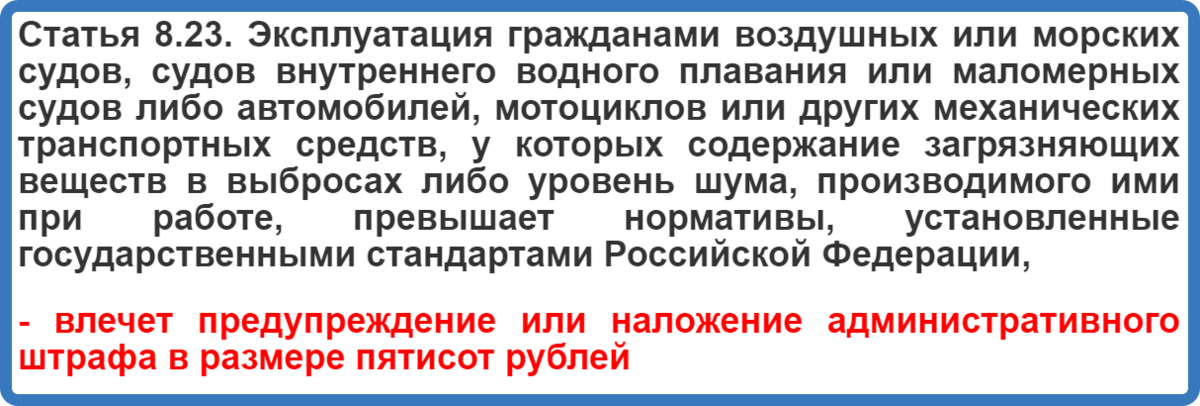 Здесь собраны основные статьи Кодекса об Административных Правонарушениях Российской Федерации. Одна из самых "не страшных" статей КоАП. Замеры выхлопа подвесных и стационарных лодочных моторов сейчас происходят редко. К тому же, большинство лодочных моторов в наше время - современные, импортные. С выбросом вредных веществ, на этих моторах, обычно нет проблем (всё в допустимых пределах). Всем (даже тем, чьи лодки не подлежат регистрации) надо хотя бы один раз, внимательно прочитать Правила плавания по внутренним водным путям РФ. При соблюдении Правил, с этой статьёй у вас не будет никаких проблем. Имейте ввиду (что бы там не утверждали ваши знакомые или "известный специалист" на форуме) - если ваша лодка не подлежит регистрации, то она так же является маломерным судном (до 20 метров длиной и до 12 чел. пассажировме