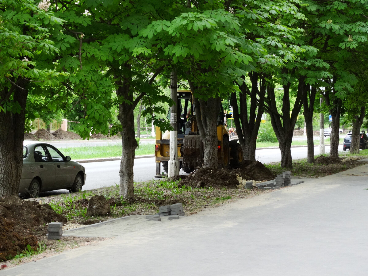 В этом году случилось одно событие, о котором говорили давно, но как-то не верилось, что его воплотят в реальность. Началось благоустройство улицы Титова в Краснооктябрьском районе города в границах от площади Титова до улицы Таращанцев. О том, что там планируются работы по благоустройству говорили неоднократно, но ничего от этого не менялось. Поэтому когда в прошлом году снова вспомнили про это, лично я воспринял новость скептически. А зря. Я ошибся. Работы по благоустройству начались. Причём, что характерно, в ходе работ не спилили ни одно дерево. Если кто не знает, по обеим сторонам улицы растут каштаны. В планах работ устройство поливочного водопровода, установка освещения, лавочек, высадка цветов, мощение тротуаров брусчаткой. Фото в статье сделаны в конце мая, поэтому сейчас там всё выглядит несколько иначе. Как только на улице закончатся работы, обязательно прогуляюсь там, сделаю фото и выложу в отдельную статью. Ну а пока, то, что есть. Экскаватор копает траншею под электрическ
