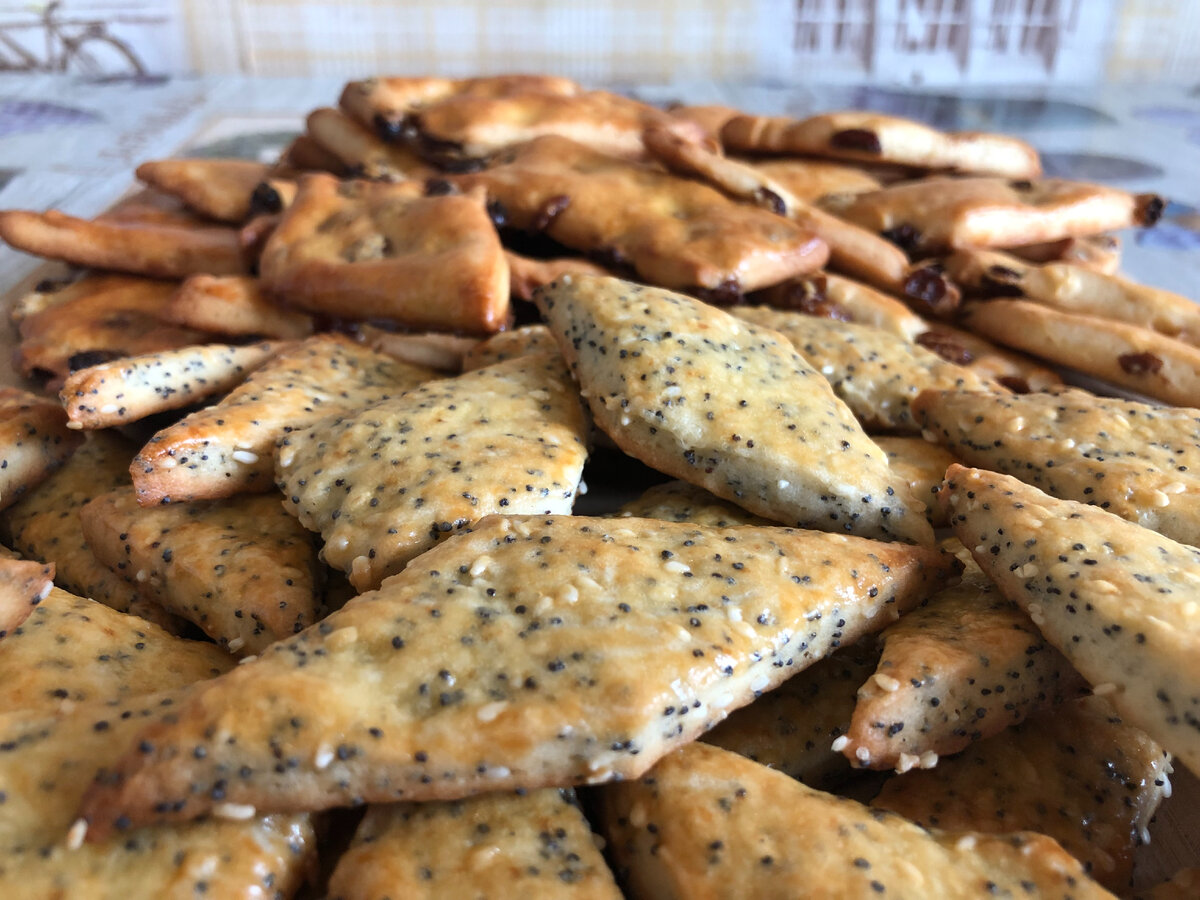 Добрый день, дорогие читатели! Сегодня предлагаю вам рецепт быстрого, хрустящего и очень вкусного печенья! Печенье похоже на крекер, только совсем не жирное. Готовится оно из простых продуктов, которые есть на каждой кухне. Рекомендую готовить сразу двойную порцию! Ингредиенты: Наполнители: Сухофрукты/семечки/орехи – по желанию Способ приготовления: Отделяем желток от одного яйца и откладываем его в отдельную емкость (им мы будем смазывать печенье перед выпечкой). В миску разбиваем 1 яйцо и белок от другого яйца. Добавляем щепотку соли, сахар, щепотку ванилина, растительное масло и молоко. Хорошо все перемешиваем венчиком до однородности. Добавляем 1 ч.л. разрыхлителя и постепенно просеиваем муку к остальным ингредиентам, замешивая тесто. Всю сразу муку не добавляйте. Сначала добавьте 250 грамм, а затем подсеивайте и следите за консистенцией. Готовое тесто должно получиться мягким и не липнуть к рукам. Половину печенья я сделаю с изюмом, а половину с маком и кунжутом. Изюм промываем и