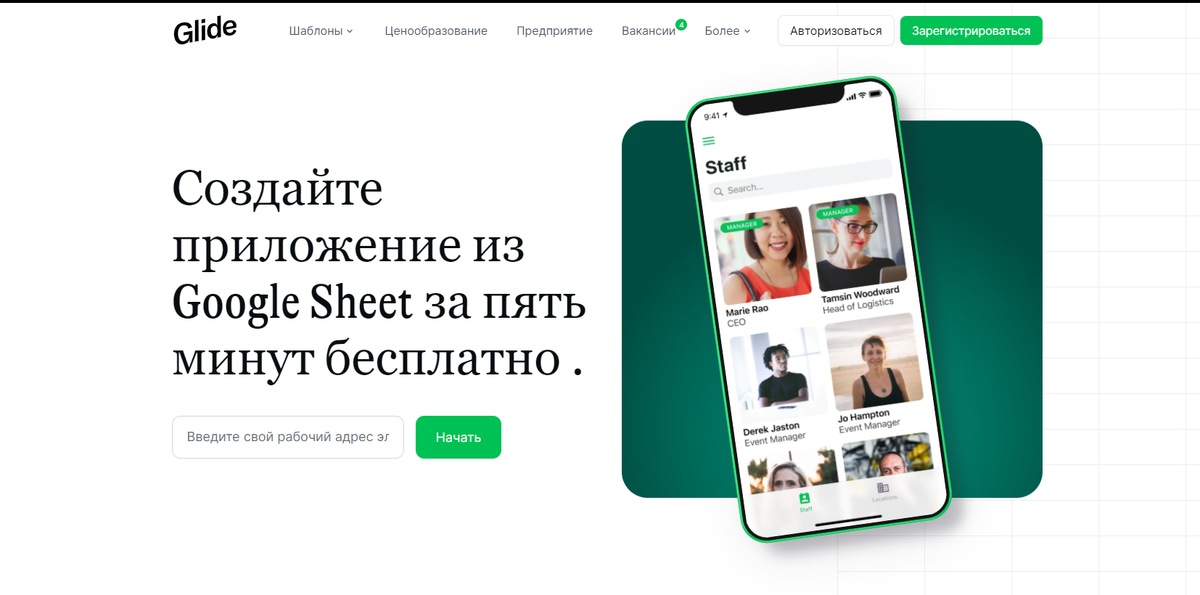 Проект Glide является no-code сервисом и дает возможность создать приложение без опыта в программировании. Интерфейс программного продукта имеет инструментарий, с помощью которого можно оперировать компонентами для отображения информации в приложении. На входе: заполненные базы данных в виде Google-таблицы или аналога - внутренней таблицы БД Глайда, на выходе: готовые кроссплатформенные PWA приложения. Глайд дает возможность использовать шаблоны приложений. Они разбиты по категориям, есть платные и бесплатные варианты готовых решений в сфере образования, здоровья, трэвэл индустрии, финансов, управления проектами, личного планирования и множество других. Если перед вами поставлена задача быстро протестировать идею приложения и сделать MVP, то Глайд превосходно с этим справится. Как сделать приложение в Glide Этап 1. Заполним таблицу БД. Определим логику категорий и структурируем данные. Даем команду Глайду создать приложение в один клик. Этап 2. Создаем вкладки раздела TABS (кнопки