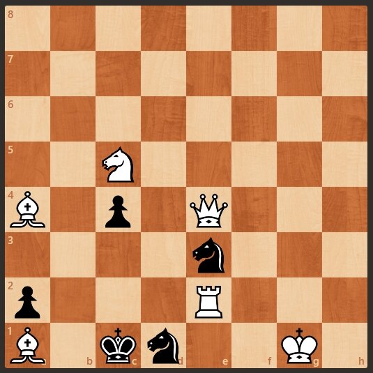 Очередная шахматная задача. Автор задачи Г. Грант, 1924 год. У черных две пешки, идущие вниз. Два черных коня спасают черного короля от мата в 1 ход. Однако белые начинают и ставят мат в 2 хода. Подписывайтесь на канал, будут новые интересные стать. Решение смотрите далее. 1. Белые отходят ферзем на поле b7. 1. ......................... черные двигают пешку на с3 (другие варианты пишите в комментариях). 2. Белые ставят мат конем на d3. Следующая задача тут>>>>