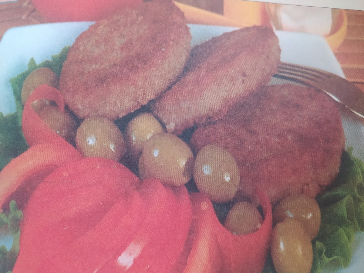 - Котлеты выложить в тарелку на листья салата, гарнировать помидорами и маслинами.