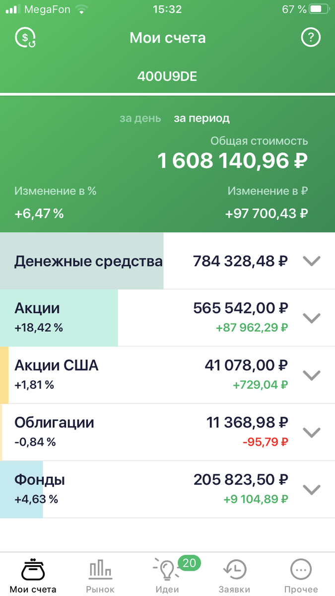 Уважаемые читатели, хочу поделиться историей своих инвестиций. Брокерский счет открыл где-то год назад в отделении Сбербанка. Открыли достаточно быстро, без лишней волокиты. Сразу положил на счёт 200000 рублей. И начал потихоньку покупать акции, фонды, облигации. Так как опыта особого не было, то обычно смотрел хорошие акции и их графики на месяц, на год или на три года. Если акция имела максимум в прошлом и теперь просела сильно, то покупал такие. Мое мнение таково, что один раз достигнутый максимум все равно будет обновлён в будущем. Постепенно добавляя деньги, довёл сумму инвестиций до 1500000. Было время, когда мои акции на 250000 просели где-то до 220000. Прошлой осенью это было. Но я не дёргался, не продавал. Потом пошёл рост акций. Больше всего выросли акции Северстали. В общем, сейчас мой портфель стоит 1610000 примерно. А ещё дивиденды поступят от Сбербанка, Сургутнефтегаза и т.д. в августе. Сейчас у меня в кэше 711 тыс . Не знаю как распорядиться. Купить акции или облигаци
