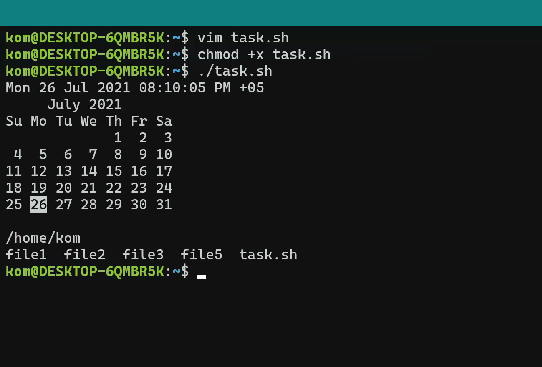 Вы только что сделали то, что с помощью команд и командной оболочки взаимодействовали с компьютером, чтобы получить текущую дату и время (date), просмотреть календарь (cal), проверить расположение текущего рабочего каталога (pwd) и получить список всех файлов и каталогов, расположенных в нем (ls).