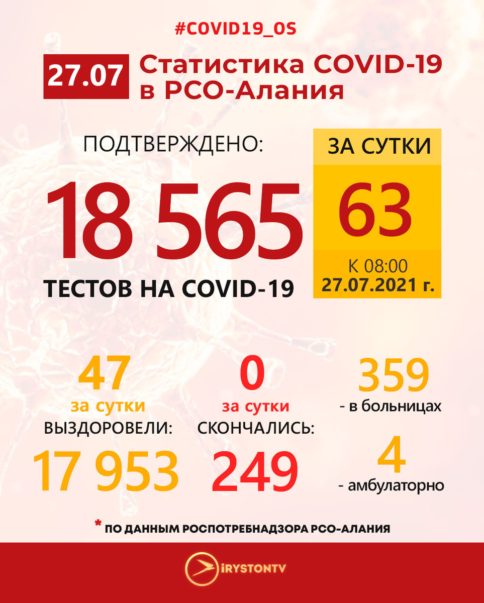 По данным Роспотребнадзора РСО-Алания на 08:00 27 июля 2021 года в Республике Северная Осетия-Алания зарегистрировано 18 565 (+63 за сутки) случаев заражения новой коронавирусной инфекцией.