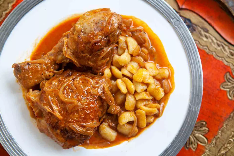 Куриный паприкаш с кусочками курицы, подрумяненный на сливочном масле, приготовленный с луком и болгарским перцем, затем поданный с добавлением небольшого количества сметаны. Ингредиенты Кусочки курицы 1200 г , предпочтительно бедра и ножки поваренная соль 2-3 столовые ложки несоленого сливочного масла 800 г желтого лука (от 2 до 3 крупных луковиц) черный перец по вкусу 2 столовые ложки сладкого перца 1 стакан куриного бульона 1/2 стакана сметаны Инструкция приготовления: Дайте кусочкам курицы вариться 4-5 минут с одной стороны, пока они не подрумянятся, затем переверните и дайте им вариться 2-3 минуты с другой стороны. (Будьте осторожны при переворачивании, чтобы не порвать кожу, если она прилипла к сковороде.) Снимите курицу со сковороды в миску, отставьте в сторону. 3. Обжарьте лук: Добавьте нарезанный лук в сотейник и готовьте его, периодически помешивая, соскребая подрумяненные кусочки курицы, пока они не подрумянятся, примерно 7 минут. 4. Добавляем паприку и черный перец: Доба