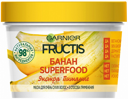 Статья из цикла "Проверено на себе": покупаем интересные новинки и тестируем на себе. Здесь всё по-честному. Сегодня мы расскажем тебе про нашумевшую маску, о которой, как нам кажется, слышали ну просто все. Маска для волос 3в1 Superfood Банан. Купить эту новинку захотелось с первого взгляда: яркая, красивая баночка, заманчивые обещания производителя и очень-очень приятная цена за большой объём средства. Что из себя представляет: Большое вёдрышко (390 мл!) с откручивающейся крышкой. Внутри очень вкусно пахнущее йогуртообразное белое желе. Способ применения: Средство одно, способов применения - много! У банановой маски целых три разных, но эффективных способа: