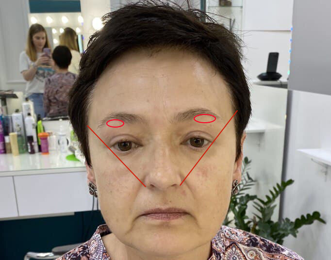 В прошлой статье я показывала ошибки в оформлении бровей. Сегодня расскажу, как это исправить и постараюсь сделать максимально подробно и понятно для вас. Пример хочу показать на своей замечательной модели, которой я делала макияж. Что мы имеем? Форма бровей не так плоха, но наблюдается перещип в теле брови, и короткие хвостики. Запрос был, чтобы брови выглядели максимально естественными. Такие брови очень легко исправить, главное знать, как это сделать;-) Давайте для начала подойдем с вами к зеркалу и посмотрим на себя. Изначально вы можете не увидеть, что есть перещип или какие-то недостатки. Чтобы их увидеть, возьмите линейку или карандаш. Что вы возьмете - неважно, главное, чтобы предмет был прямым. Есть три основные линии, по которым можно определить, что же с нашими бровями не так. Данные линии показаны на фото ниже. Когда будете проверять на себе, можно сделать в нужных местах небольшие пометки, например, светлым карандашом. Первая линия определяет правильное начало брови конкре