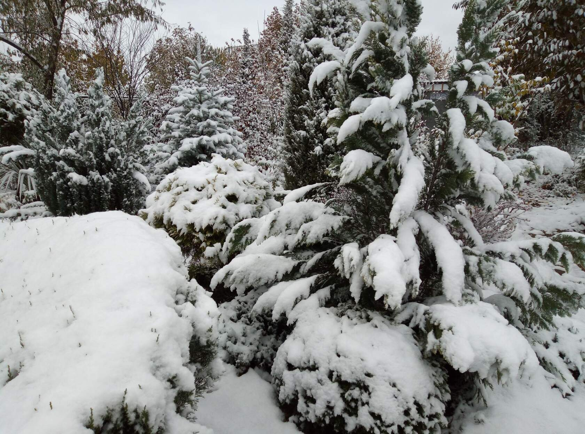 Такая наша зима! Сад и зимой ,когда нет снега, живой и зелёный. Кроме хвойных в саду растут вечнозелёные лиственные растения- бересклеты, самшиты, жимолости. Долго сохраняются ягоды на барбарисах. Они висят всю зиму. Хвойные имеют самый разный цвет. Некоторые туи меняют цвет на жёлтый или оранжевый оттенок. Кипарисовики цвет почти не меняют. Они летом и зимой одинакового цвета. Хвоя у разных сортов самая разная по цвету. В саду нужно обязательно сажать хвойные растения. Иначе будет скучная, серая и долгая зима.