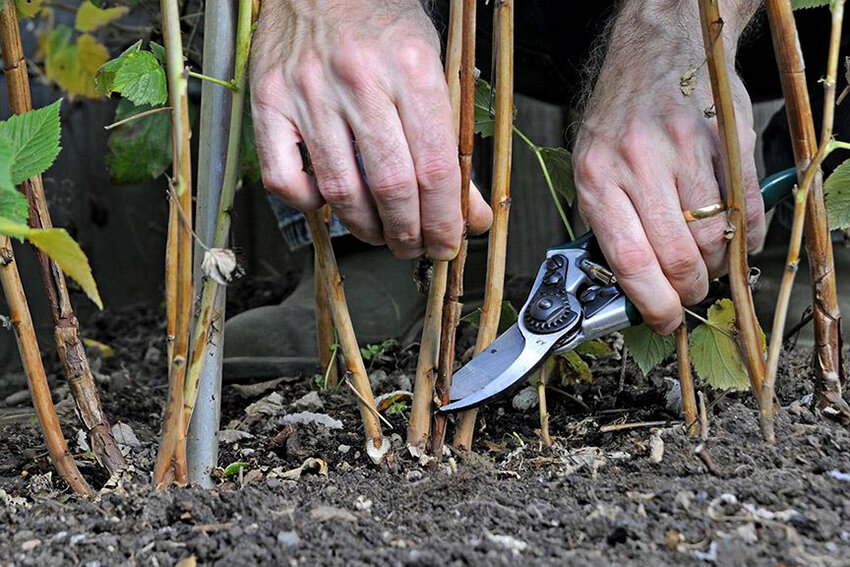 Важно! Отплодоносившие побеги малины нужно вырезать под самый корень, иногда можно даже чуточку раскопать их, а место присыпать свежей почвой.
