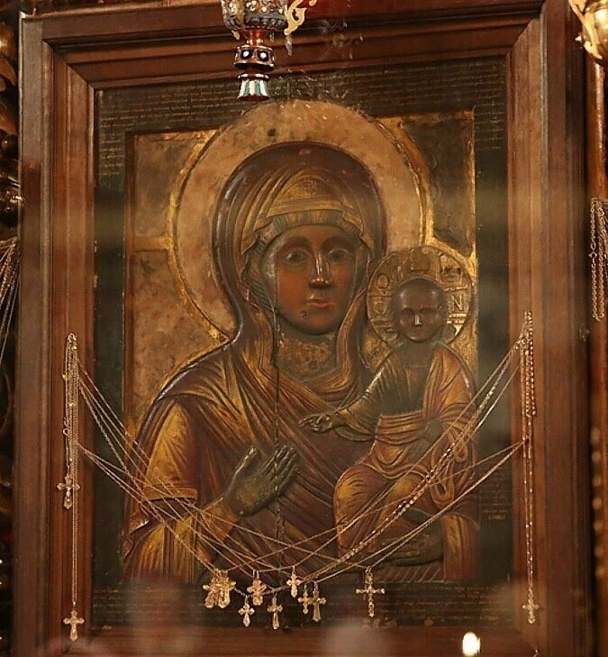 Чудотворная икона Божией Матери " Влахернская", изготовлена из восковой мастики и хранится в Успенском соборе Московского Кремля. История обретения святыни возвращает нас в Иерусалим, а 421-422 года. Супруга византийского императора Феодосия II (408 — 450) Евдокия, путешествовавшая в Иерусалим для поклонения святым местам в 436 -437 годах, приобрела икону и отослала ее в Константинополь в дар сестре императора, св. Пульхерии. Икона была поставлена во Влахернской церкви, туда же где хранилась честная риза Богородицы. Ещё эту икону называют Путеводительницей (Одигитрией). В 626 году, Патриарх Сергий обходил стены Константинополя во время осады города аварами. "К Тебе, о Матерь Пресвятая,