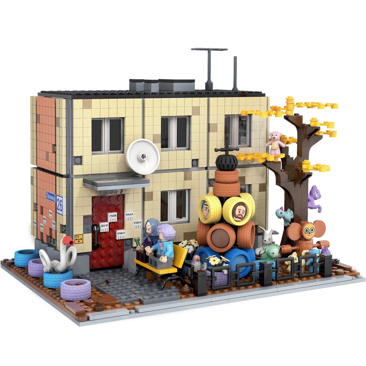 Мухомор из тазов, заяц из двух шин, павлин из компакт-дисков и конечно же шинолебедь — все эти шедевры придворового народного искусства представлены в прекрасном онлайн-музее ЖЭК-арта. В честь появления нового оригинального пространства художник Артём Бизяев представил тематический LEGO-набор. Вольная фантазия включает в себя небольшой двухэтажный дом, стилизованный под скромное панельное сооружение. Колорита добавляют неизменные атрибуты: старушки на лавочке у подъезда, входная дверь, обклеенная бумажным спамом. Также в глаза бросается ТВ-тарелка и богато украшенный предметами народного творчества двор, включая неизменного шинолебедя. Конечно, набор не пойдёт в серию, это лишь отражение текущей действительности в кубиках и деталях. Но вещь эмоциональная и, к сожалению, реалистичная. Вот ещё несколько душевных работ автора. Ракета «Восток-1» — это первый в мире аппарат, на котором человек поднялся на околоземную орбиту. Также в набор входит Юрий Гагарин: Дом и персонажи из забавного се