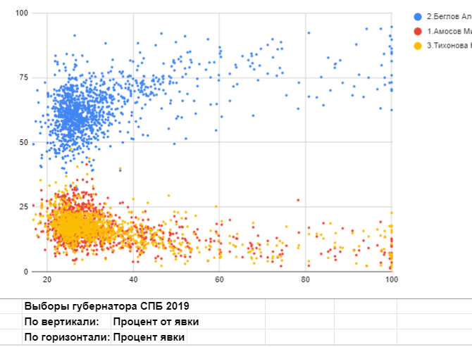 Согласно данным экзит-полов Беглов получил 56%, Амосов набирал 21, Тихонова 19*, однако, на выходе из черного ящика избиркома как кроля из черного цилиндра нам вытащили 64, 16 и 17 соответственно. Беглов получил больше, остальные меньше. Все логично - от одних отрезали другому пришили. Но мы разберемся как именно, чтобы не быть голословными. Так выглядят эти выборы на стандартном графике, который показывает зависимость процента кандидата от явки: С одной стороны мы видим как растет процент Беглова с ростом явки. С другой, видим, что его результат может превышать 80% и без роста явки. Траектория распределения основной массы точек как бы образует галочку из короткой вертикальной левой черты (скорее овала) и длинной наклонной правой. Понятно, что, правая черта родилась из вбросов и приписок сделанных поверх изначальных результатов. Они приводили к росту явки и этим уводили точки вверх и вправо. Труднее обосновать левую часть галочки. По моему мнению она возникла в результате перекладки бю