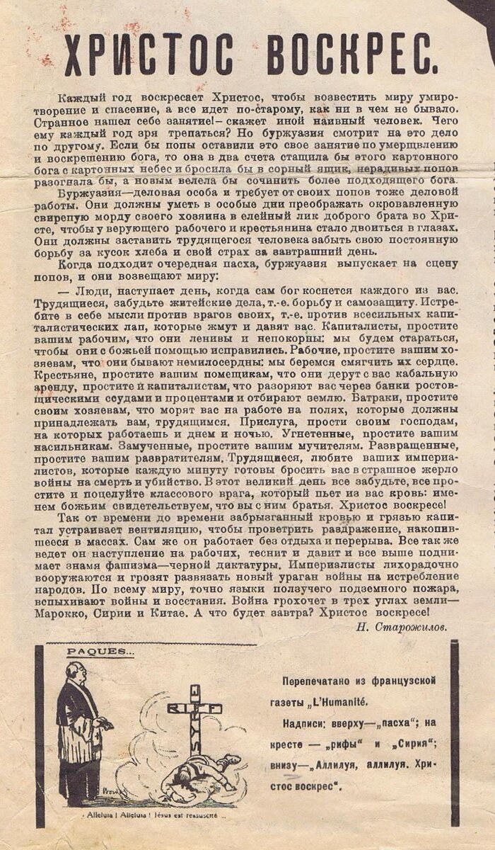 «Безбожник у станка». 1926. № 5. Говорят, 20-е годы 20-го века были грубы, беспощадны, лишены тонкостей культуры. А теперь вот христианство уже достаточно наполнено изысканными хрупкостями яиц Фаберже, вышиванками праздничных фелоней и прочими культурными завоеваниями Святаго Духа. И потому требует к себе иного отношения. Что ж, измените форму отношения к христианству согласно современности. Допустите, что вы христианин или христианка. И все перекрасившиеся коммунистические и комсомольские вожди враз стали христианами, заделавшись параллельно олигархами. Что решительно совпадает с реальностью. И вы действительно верите в доброе семейное общение с ними? Вы верите, что вы теперь братья и сёстры во Христе? И полезете христосоваться на Пасху с ними? И они вас до себя допустят с вашими плебейскими лобызаниями в их олигархические губы? Чёрт вас побери! Да побойтесь же Бога, наконец! 2018.07.20.