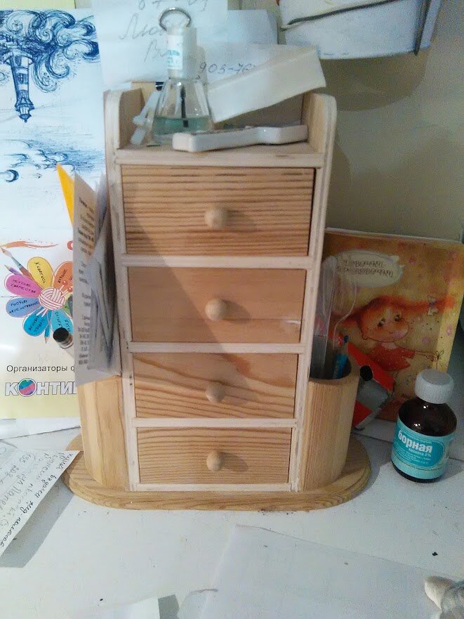 Такую карандашницу купила в магазине Леонардо, даже представить не могла, что она так вдохновит моего 7 летнего сына. Вот такая заготовка для творчества, так понравилась моему сыну, что он декорировал ее много раз, и просил купить ему еще и еще - Сперва мы вынули ящички и немного прошлись шкуркой. - Затем покрасили ящички и основу в разные цвета. Обратите внимание, что бы ребенок покрывал заготовку тонким слоем краски, иначе, возможно детали (ящички) не будут вставляться и открываться свободно. Использовали обычную гуашь. - После высыхания покрыли акриловым лаком, что бы защитить карандашницу от пыли и воды. Да и лак придал глянец заготовке и сделал поверхность гладкой и приятной. После того как лак полностью высох, Приклеили на клей "момент" различные элементы из бумаги (можно даже распечатать на цветном принтере понравившийся мотив, или приклеить рисунки ребенка вырезав их по контуру) Поскольку у нас карандашница была для учителя, мы придерживались школьной темы Еще добавили