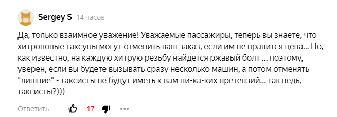 Обиженные в комментариях появились и начали высказывать мнение о том, что таксисты зажрались! Но я писал совсем о другом меня явно не поняли. Я не защищаю водителей такси или пассажиров, что греха таить везде есть не совсем адекватные люди. И когда я писал, что надо быть к друг другу более вежливым в этом и был мой посыл. Но некоторых якобы не пассажиров, а граждан, которые ездят на своих авто, бомбануло по полной 🤣. Выступление сего субъекта абсолютно не трогает никакого таксиста, вызывайте если хотите хоть десять такси, не буду расписывать последствия в виде нервов и потраченных денег на ложный вызов, а то что от сервиса вызова такси вас могут отстранить возможно. Серега мне поднял настроение с утра, давно так не смеялся, когда читаешь такие комментарии, то сразу возникает вопрос, что в жизни могло произойти, что человека так сильно бомбит🤣. Серега, что с тобой сделали таксисты? Возникает резонный вопрос: "Почему пассажиры думают, что если водитель работает в такси на своей машин