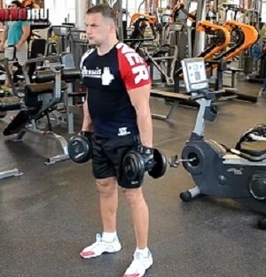 Упражнение для коррекции передней части бедра - квадрицепса. Техника выполнения: Стоя, ноги расставлены уже ширины плеч, спина прямая, гантели удерживаются в свободно опущенных руках. Взгляд зафиксирован на точке, находящейся на уровне лба. Сгибая колени, выполнить приседание до момента, когда бедра пройдут линию параллели полу. На протяжении всего движения, спина должна быть прямая. Можно увеличить нагрузку на переднюю часть бедра, смещая спортивные снаряды за спину. В варианте, когда вместо гантелей используются гири, упражнение выполняется на предупреждающей удары о пол спортивных снарядов невысокой платформе. Полный обзор упражнений и программ тренировок доступен по ссылке https://author.today/work/138854